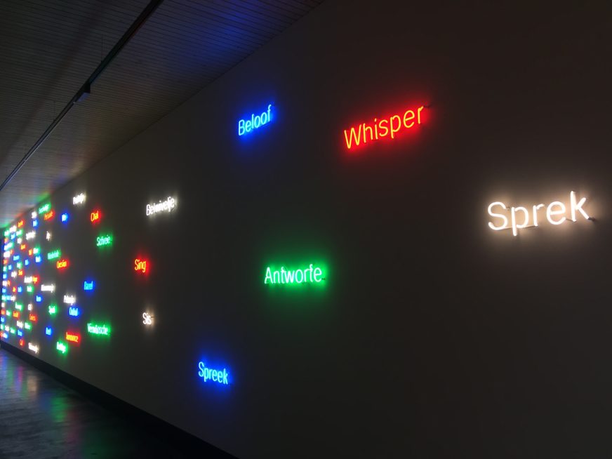 ‘Hear/Höre/Hoor/Hear’ is an installation of 88 single neon words in Frisian, German, Dutch and English, where each word refers to different uses of human speech or sound, from ‘whisper’ and ‘sing’ to ‘confess’, ‘describe’, ‘translate’ and ‘question’. Alphabets, is a multi-layered sound installation on ten speakers that mixes approximately 50 languages, the composition built from recordings of speakers who each recite the alphabet, with examples of words that start with each letter. To Talk To You, meanwhile is a recording by Etchells himself, comprising improvised repetitions and variations the same sentence, addressed to the visitor in the form of a series of phone messages.